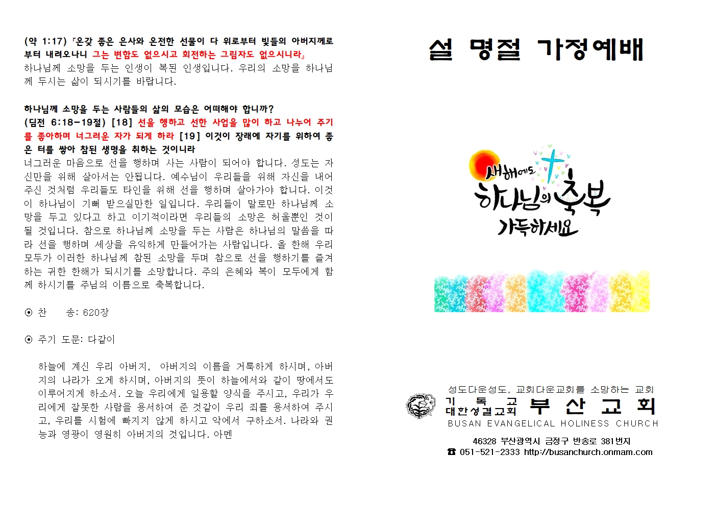 26년 설명절 가정예배서 운영자 2026-02-07 추천 0 댓글 0 조회 70 http://busanchurch.onmam.com/bbs/bbsView/88/6605771 첨부파일 (1) 2026년설명절가정예배서.pdf 0